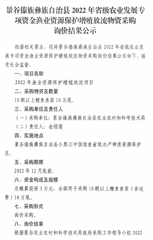 365beat中文版_365防伪码查询系统_365bet最稳定网址傣族彝族自治县2022年省级农业发展专项资金渔业资源保护增殖放流物资采购询价结果公示
