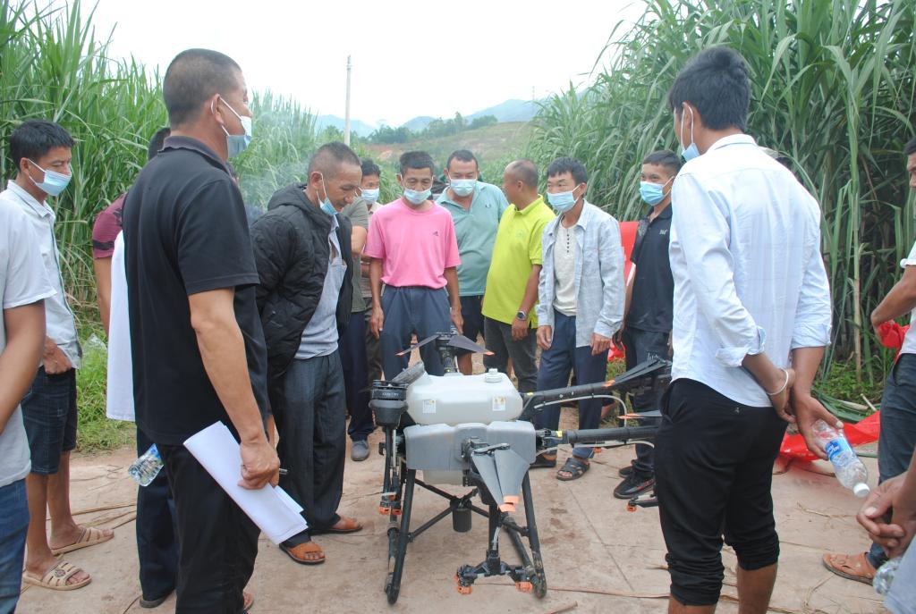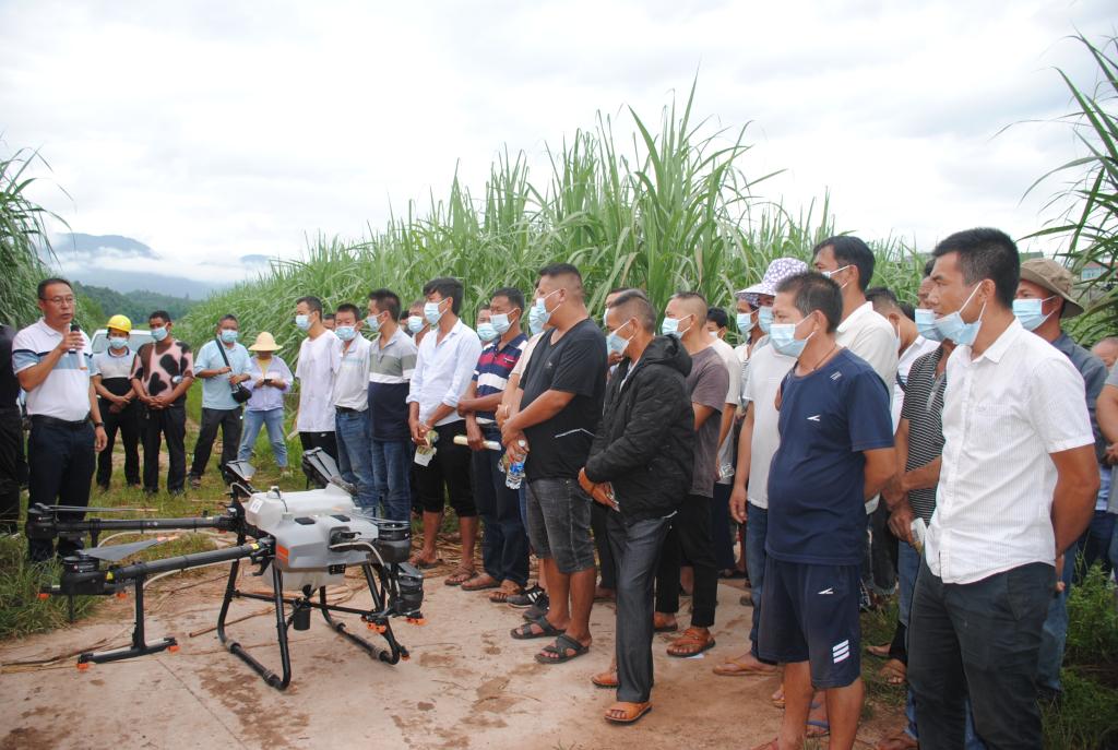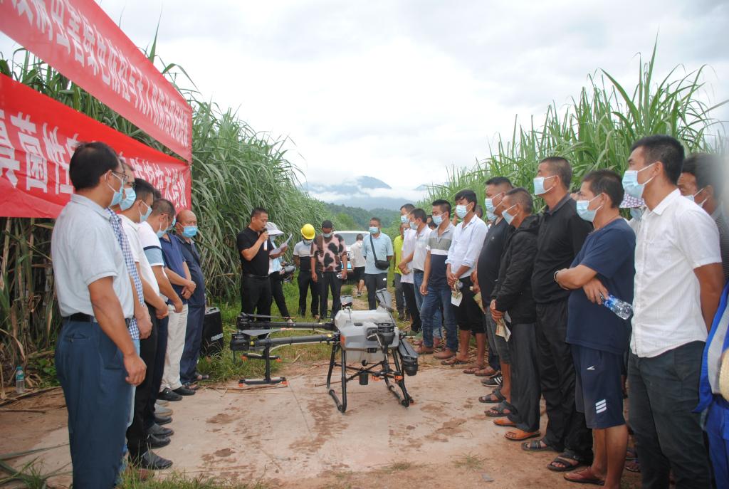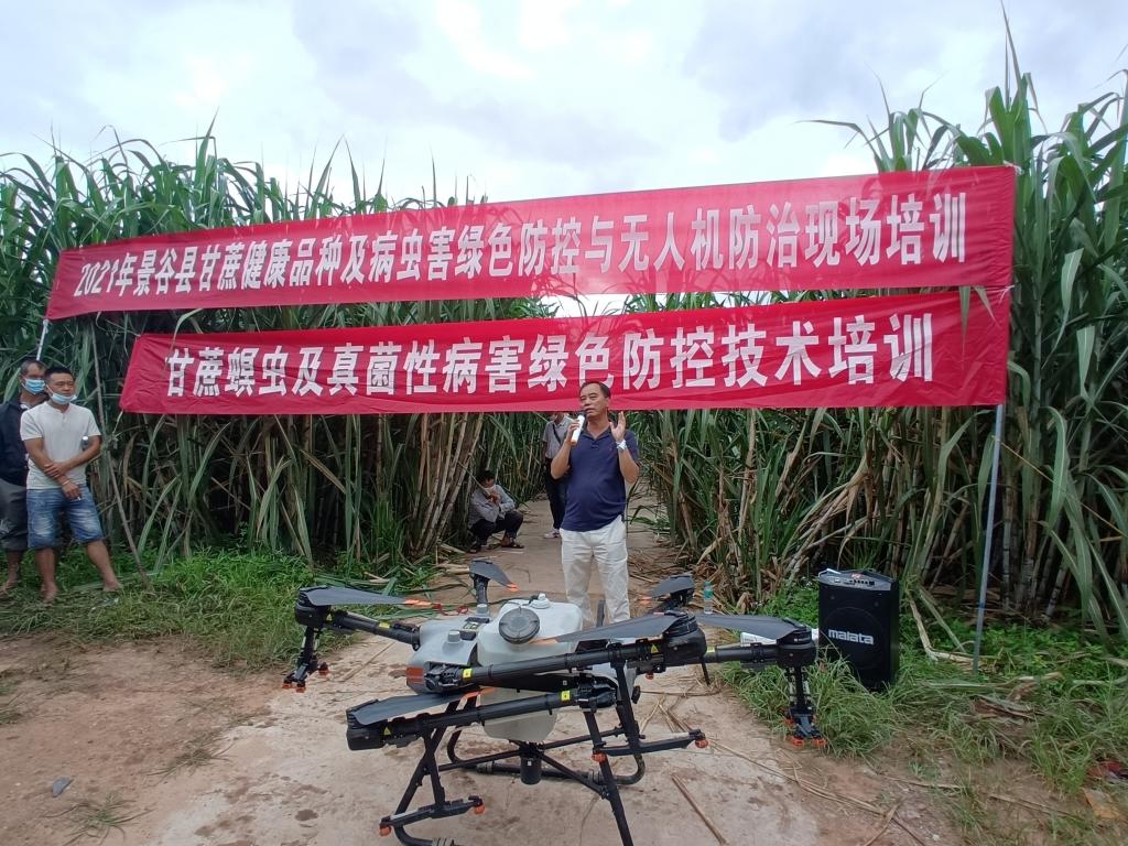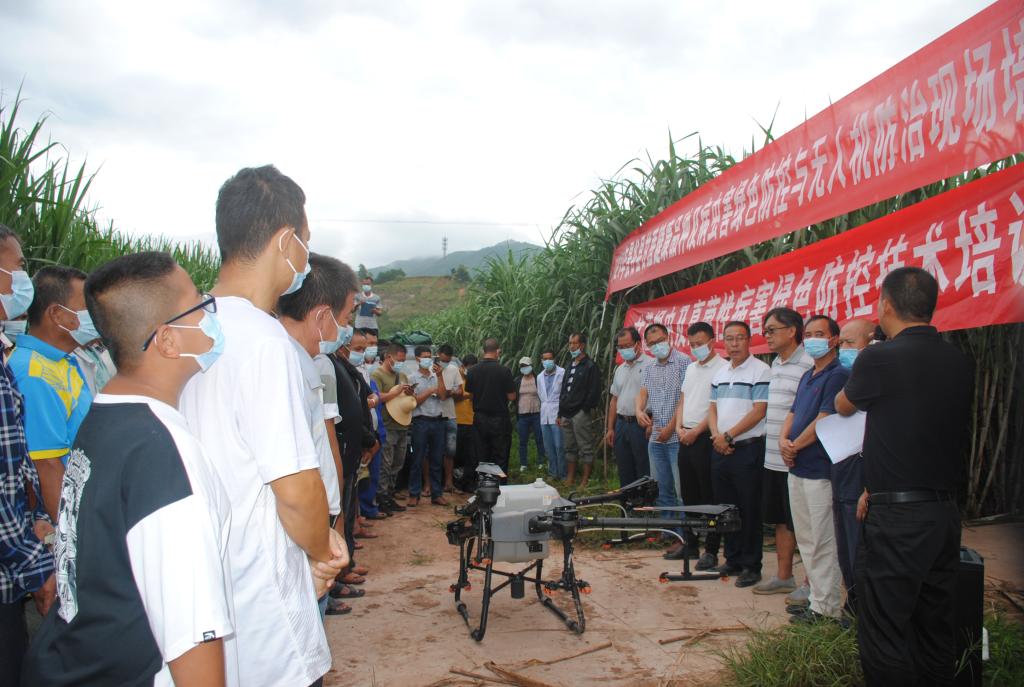 此次培训地点设在威远镇芒哈村。共有100余名基层农技人员、糖厂技术人员及蔗农代表等参训,发放培训资料100余份,完成地方科技成果转化项目良种良法核心示范区病虫害绿色防控与无人机防治200余亩。培训期间,陈学宽研究员以现代甘蔗新良种种植配套技术为主题,结合云蔗05-51、云蔗08-1609、柳城05-136等现代新品种的特点和适宜种植的环境进行了详细的授课培训;赵俊研究员就目前甘蔗种植主要存在问题,结合现代甘蔗产业发展趋势和产业政策等方面进行了详细全面的分析和讲解;尹炯副研究员和罗志明副研究员主要以草地贪夜蛾、螟虫、蚜虫、蓟马等病虫害防控技术和用药措施为主题,介绍了几种甘蔗常见病虫害的为害特征、为害方式和生活习性及虫害的预测和预防措施,并现场进行无人机飞防示范,圆满完成了田间甘蔗病虫害的有效防控和技术指导示范。