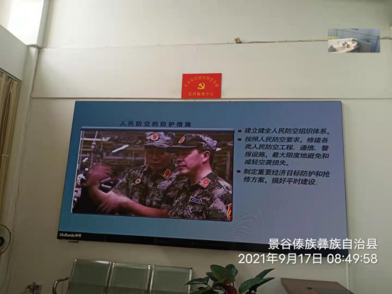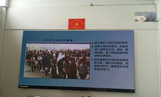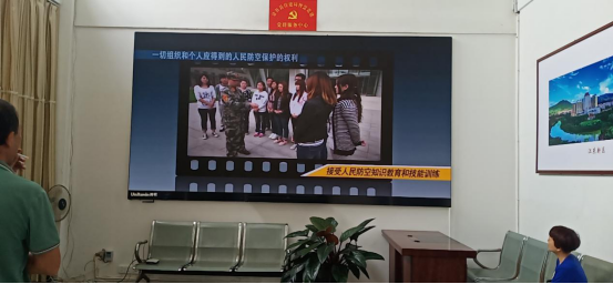 在宣传活动周期间,每天在单位电子显示屏滚动播放人防宣传教育视频。